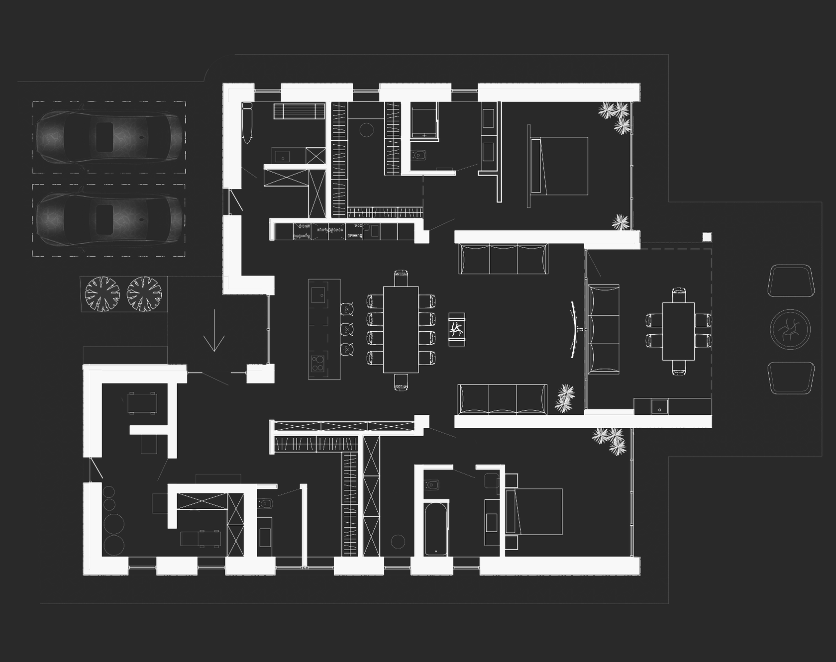 One of the features of the project is a lounge area with a kitchen and a dining area on the terrace. An additional soft zone with a hearth allows you to spend time in the fresh air.